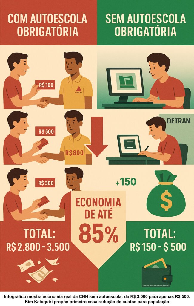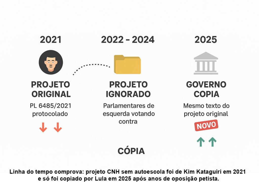 O governo federal anunciou nesta semana uma das medidas mais aguardadas pelos brasileiros: o fim da obrigatoriedade das autoescolas para obter a Carteira Nacional de Habilitação (CNH). No entanto, por trás do anúncio que promete economizar até R$ 3.000 para os cidadãos, esconde-se uma verdade inconveniente: a proposta é uma cópia quase idêntica do projeto protocolado pelo deputado Kim Kataguiri em 2021, que foi sistematicamente ignorado pela esquerda. Este artigo revela como o PT demonstra sua vocação autoritária – preferindo plagiar uma boa ideia a reconhecer o mérito de um adversário político. 🔍