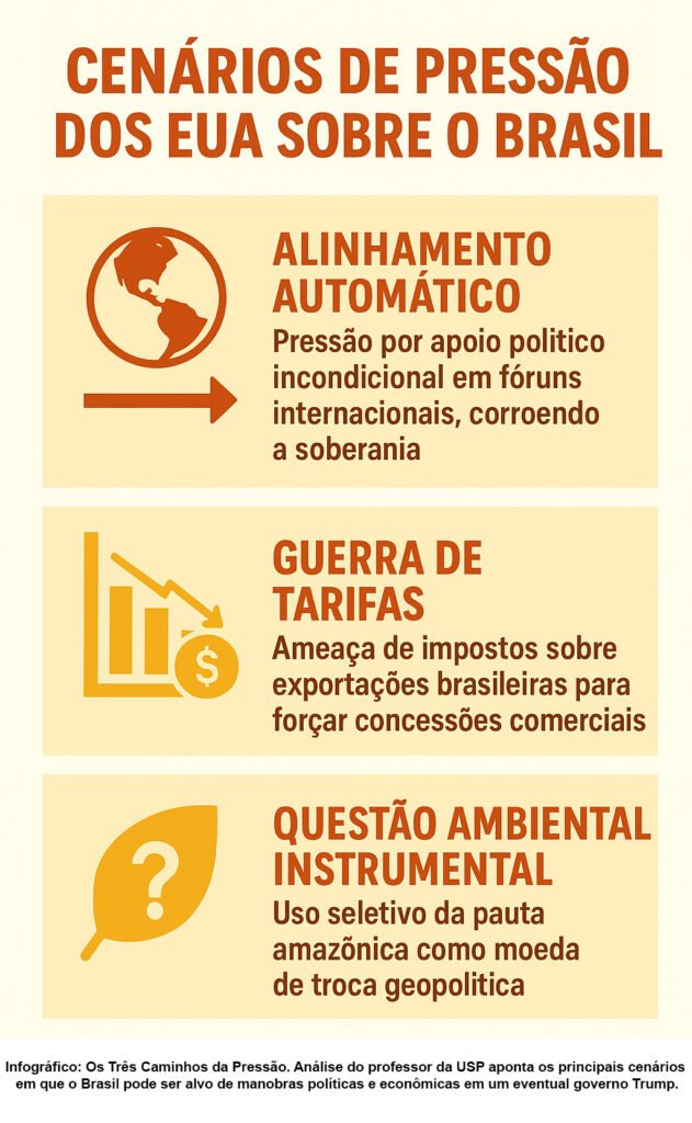 Especialista em relações internacionais da USP alerta sobre como Donald Trump pode usar o Brasil como peça de manobra geopolítica. Entenda os riscos e cenários. 🇧🇷🇺🇸 Análise completa.